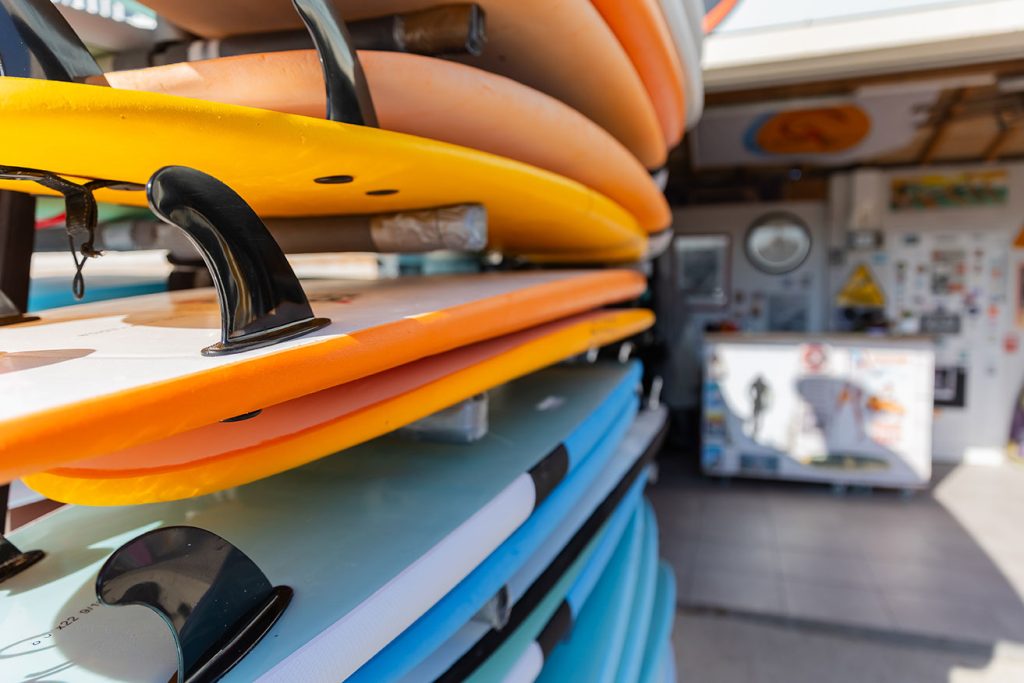 Possibilité de louer du matériel, débutant, intermédiaire avec des planches en mousse, planches évolutives et shortboard.